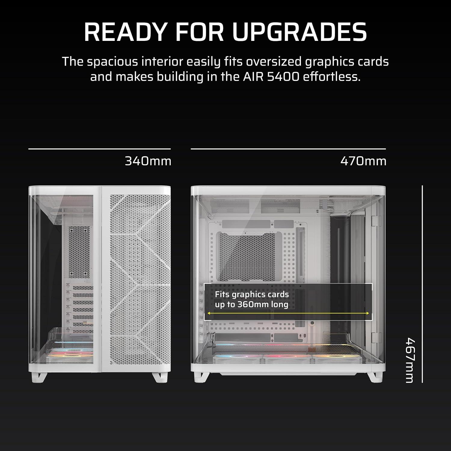 The CORSAIR AIR 5400 features an innovative triple-chamber design that delivers exceptional cooling along with a radical new look for DIY PCs. It sports a dedicated 360mm radiator chamber, keeping the heat associated with CPU cooling out of the main chamber for improved thermals. The main chamber is also kept frosty with airflow ducts on the top-and-bottom fan arrays, which increase airflow velocity for chilly temps with very low noise. The wraparound glass exterior provides a stunning panoramic view, and the included reverse-rotor RGB fans offer powerful cooling with unobstructed RGB lighting for a PC that looks as good as it performs.
