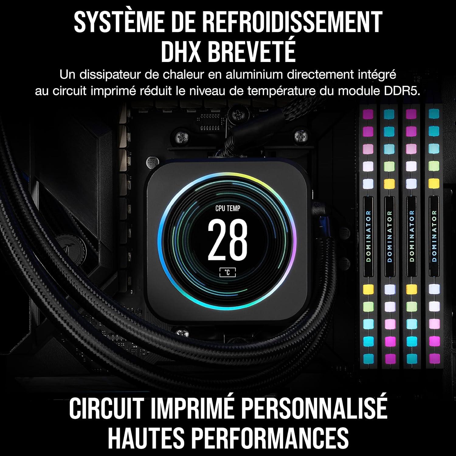 Push the limits of performance with CORSAIR DOMINATOR PLATINUM RGB DDR5 Memory optimized for AMD®. DDR5 delivers higher frequencies and greater capacities than previous generation memory, helping your system power through complex tasks faster than ever before. With world-renowned design lit by 12 ultra-bright CAPELLIX RGB LEDs, DOMINATOR PLATINUM RGB DDR5 complements the styling and power of the most high-end systems. Hand-sorted, tightly screened memory chips and a custom PCB cooled by patented DHX cooling technology maintain consistently high performance. CORSAIR iCUE software enables RGB lighting customization and synchronization, real-time performance information, and onboard voltage regulation for easier, finely controlled overclocking. Supporting custom AMD EXPO profiles and backed by a limited lifetime warranty, DOMINATOR PLATINUM RGB DDR5 for AMD is in a class of its own.