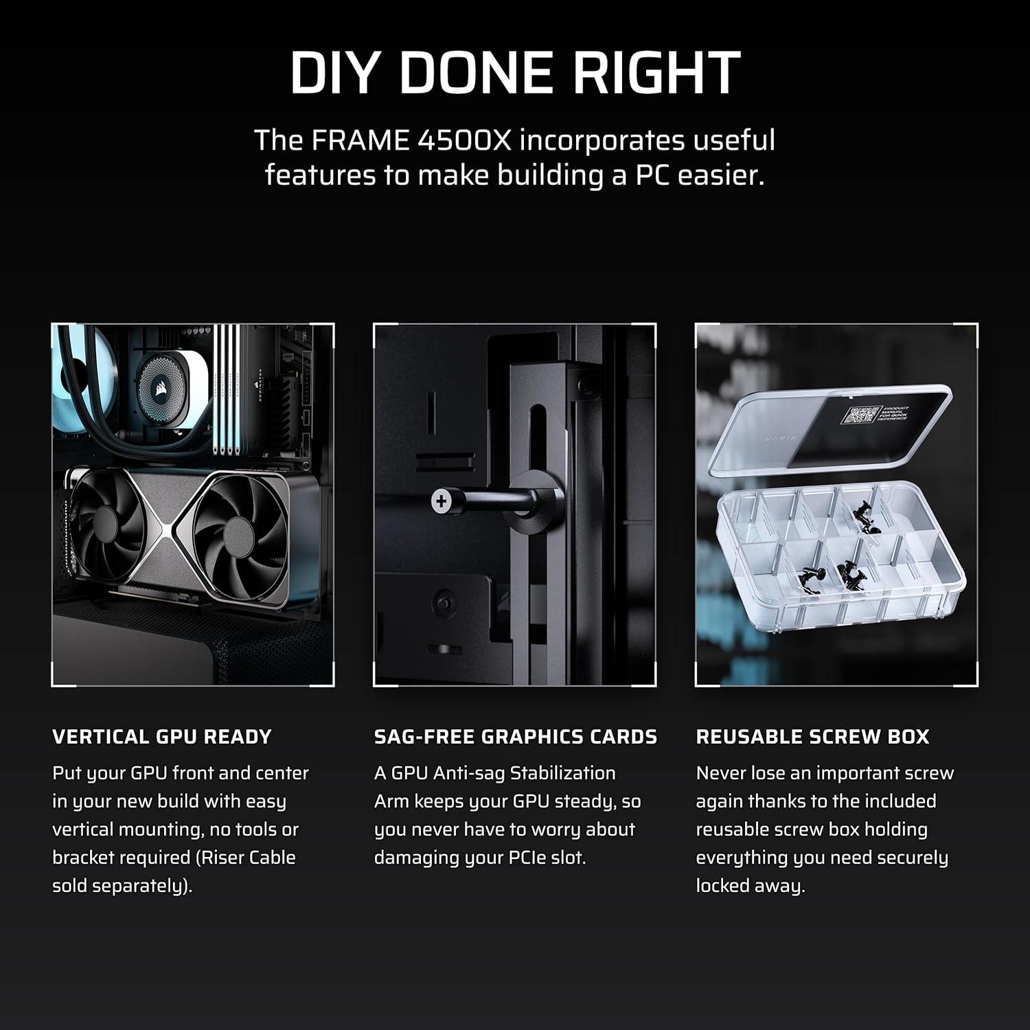 The CORSAIR FRAME 4500X is a mid-tower chassis that offers stunning visuals and high-performance features, all built on the customizable FRAME Modular Case System. Immaculate builds are achievable thanks to the single-piece wraparound glass panel and support for reverse-connector motherboards, while temps stay frosty with room for dual 360mm radiators and up to 10x 120mm fans or 5x 140mm fans using the InfiniRail fan-mounting system. The roomy interior is designed for oversized GPUs and includes an Anti-Sag arm, and reverse-rotor RGB fans complete the package. If your mood changes down the road, the case is customizable via the modular FRAME system, so it’s also future-proof. Tech Specs Dimensions (mm): 499 x 256 x 471 mm Material: Steel, Tempered Glass, Plastic Cooling Layout: Front: None, Top: 3x 120mm, 2x 140mm, Side: 3x 120mm, 2x 140mm (3x RS120R ARGB Fans Included), PSU Shroud: 2x 120mm, Bottom: 1x 120mm, Rear: 1x 120mm, 1x 140mm Radiator Compatibility: Front: None, Top: 360mm, 280mm, 240mm, Side: 360mm, 280mm, 240mm, Bottom: None, PSU Shroud: None, Rear: 120mm, 140mm Expansion Slots (Main): 8 Horizontal or 3 Vertical Motherboard (Main): Mini-ITX, Micro-ATX, ATX, E-ATX (305mm x 277mm) Storage: 2x 2.5″ SSDs, 1x 3.5″ HDDs Clearances: PSU: 250mm, CPU Cooler: 185mm, GPU: 460mm Dust Filters: Bottom, Right Side Front I/O: USB 3.2 Gen1 Type-A (x2), USB 3.2 Gen2 Type-C (x1), Headphone/Microphone (x1), Power Power Supply Compatibility: ATX Box Contents: FRAME 4500X Case, 3x RS120R ARGB Fans, Case Accessory Box