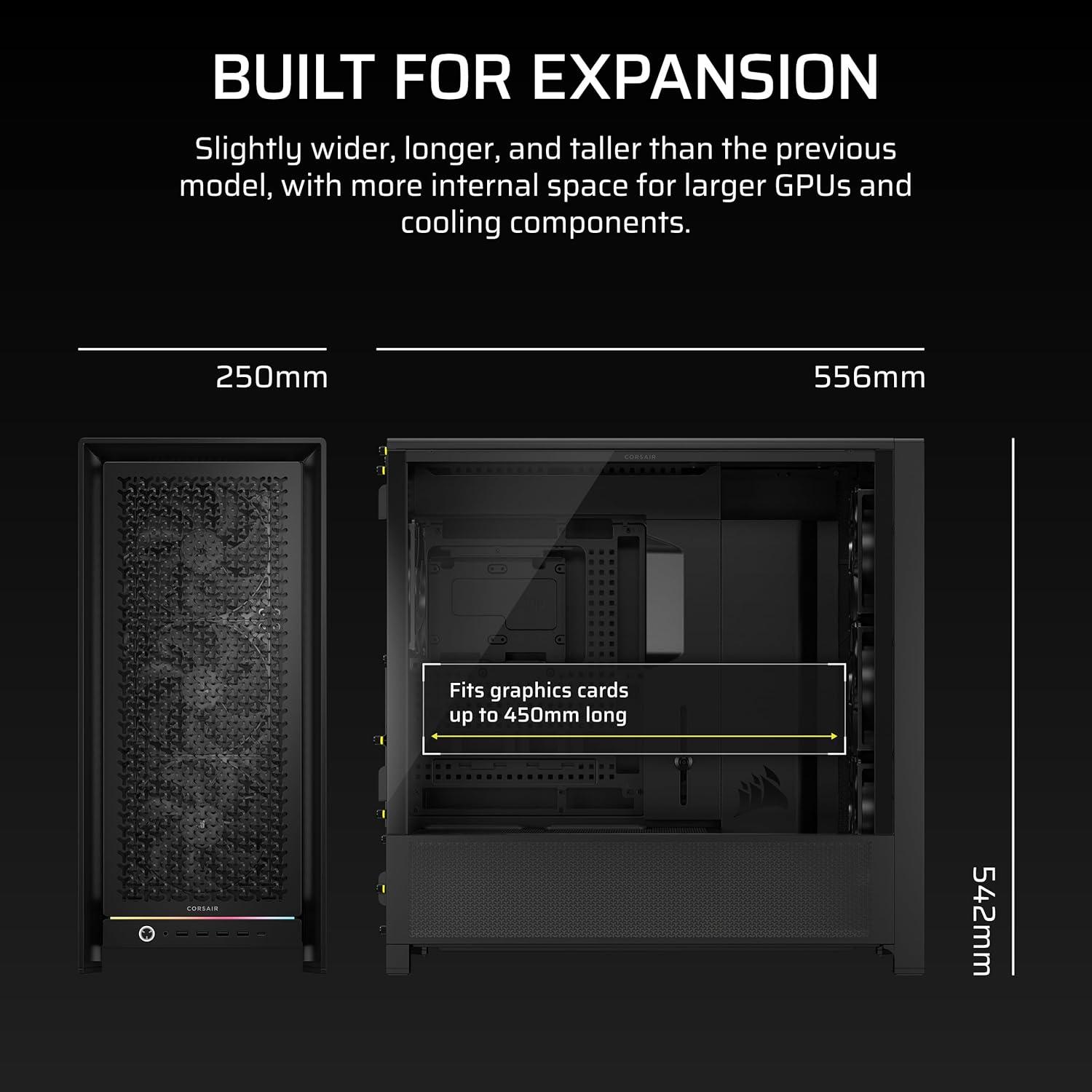 Build the high-airflow, low-temperature PC of your dreams in the CORSAIR FRAME 5000D high-airflow case, featuring the innovative FRAME Modular Case System offering unprecedented flexibility to perfectly customize your build as you want it. The InfiniRail™ Mounting System simplifies fan installation, while support for up to a 420mm radiator and a new 3D Y-Pattern Airflow front panel ensure cool air is directed precisely where it’s needed most. The increased width and length ensure compatibility with the most powerful graphics cards and cooling options, with support for reverse connection motherboards future-proofing your system. We provide the frame. You create the art. Technical Specifications Dimensions: 21.89in x 9.84in x 21.34in Material: Steel, Tempered Glass Expansion Slots (Main): 8 Horizontal or 3 Vertical Motherboard (Main): Mini-ITX, Micro-ATX, ATX, E-ATX (305mm x 277mm) Storage: 6x 2.5″ SSDs, 2x 3.5″ HDDs Clearances: PSU: 250mm, CPU Cooler: 175mm, GPU: 450mm Dust Filters: Front, Bottom, Right Side, Left Side Front I/O: USB 3.2 Gen1 Type-A (x4), USB 3.2 Gen2 Type-C (x1), Headphone/Microphone (x1), Power Power Supply Compatibility: ATX