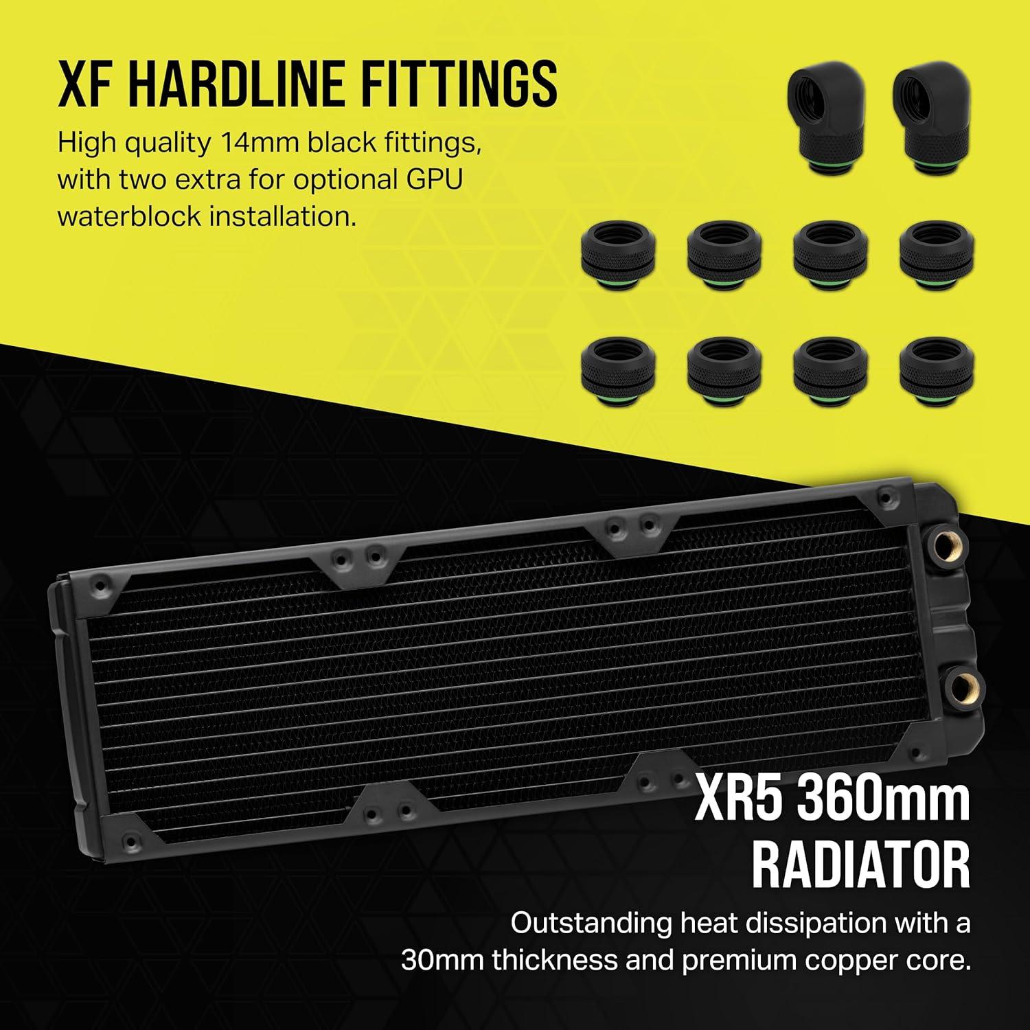 CORSAIR Hydro X Series iCUE Link XH405i Custom Cooling Kit – Hardline Water Cooling Loop – XC7 Elite CPU Water Block – XD5 Elite D5 Pump Res – XR5 360mm Radiator – 3X QX120 RGB Fans – Stealth Gray(Gray)