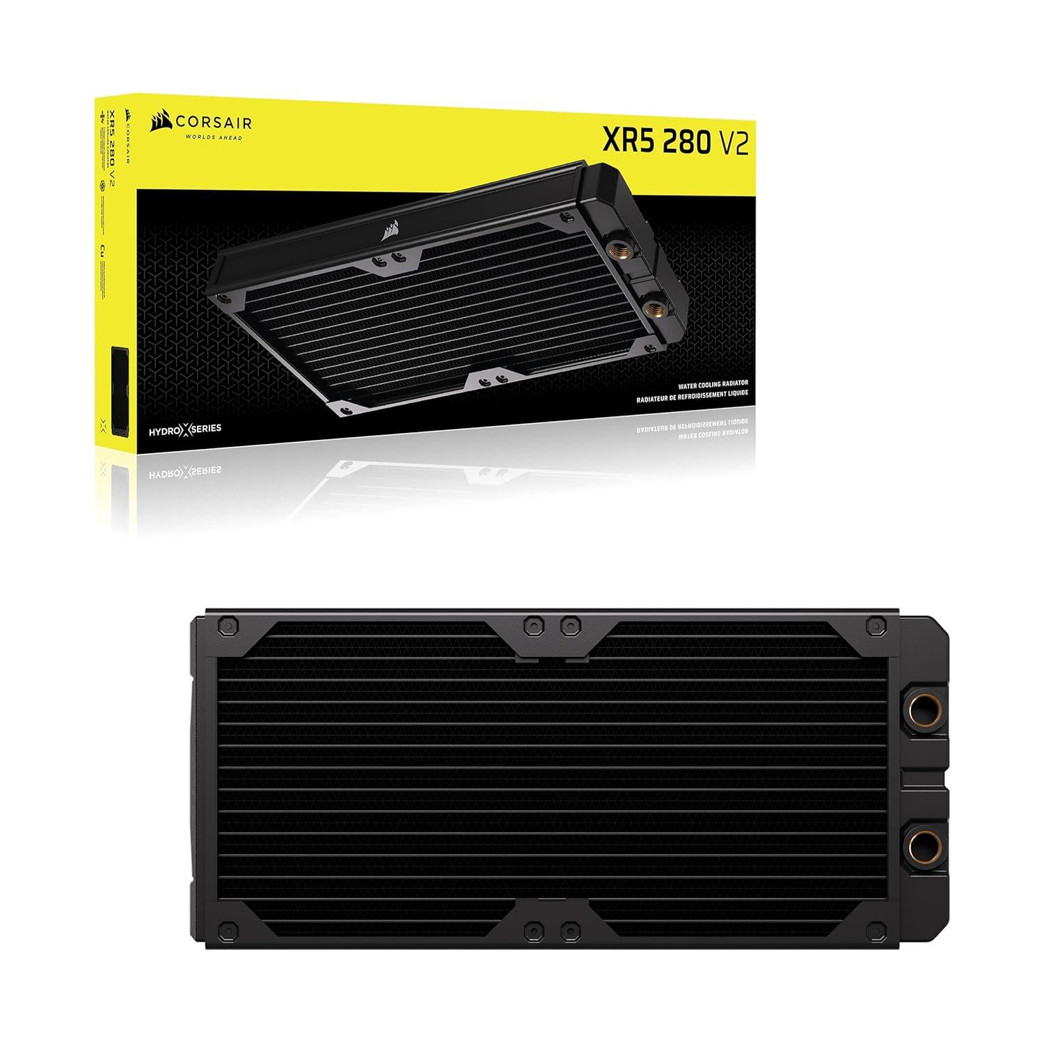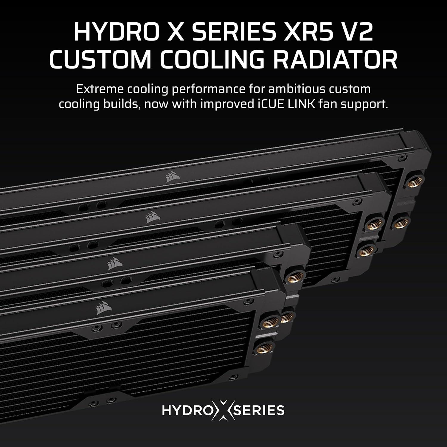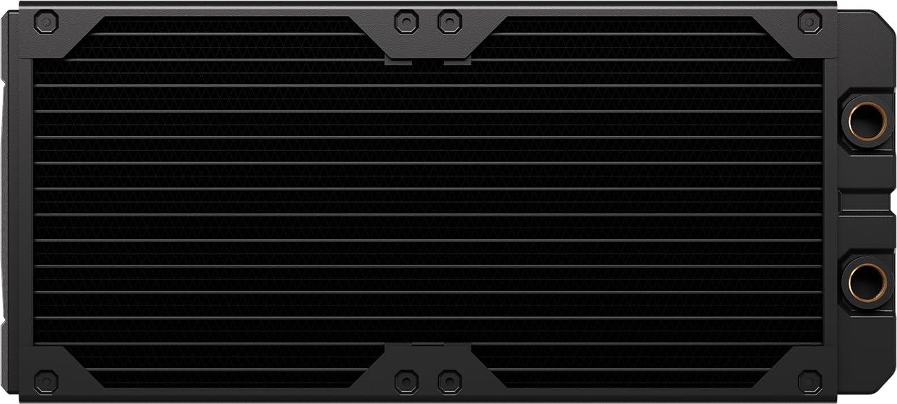The CORSAIR Hydro X Series XR5 V2 Custom Cooling Radiator delivers extreme cooling performance, featuring a 30mm thick radiator and 25-micron thin cooling fins to maximize heat dissipation surface area. A premium copper radiator core is optimized for use alongside copper CPU and GPU water blocks, enhancing thermal transfer efficiency. Intuitive features, such as Integrated Fan Screw Guides, built-in Screw Protection Plates, improved support for iCUE LINK fans, simplify installation and help prevent radiator damage. With standard G1/4″ threads for universal compatibility and a surface area capable of handling cutting-edge high-performance hardware, the Hydro X Series XR5 V2 Custom Cooling Radiator is engineered to cool even the most ambitious custom liquid cooling loops and conquer heat.