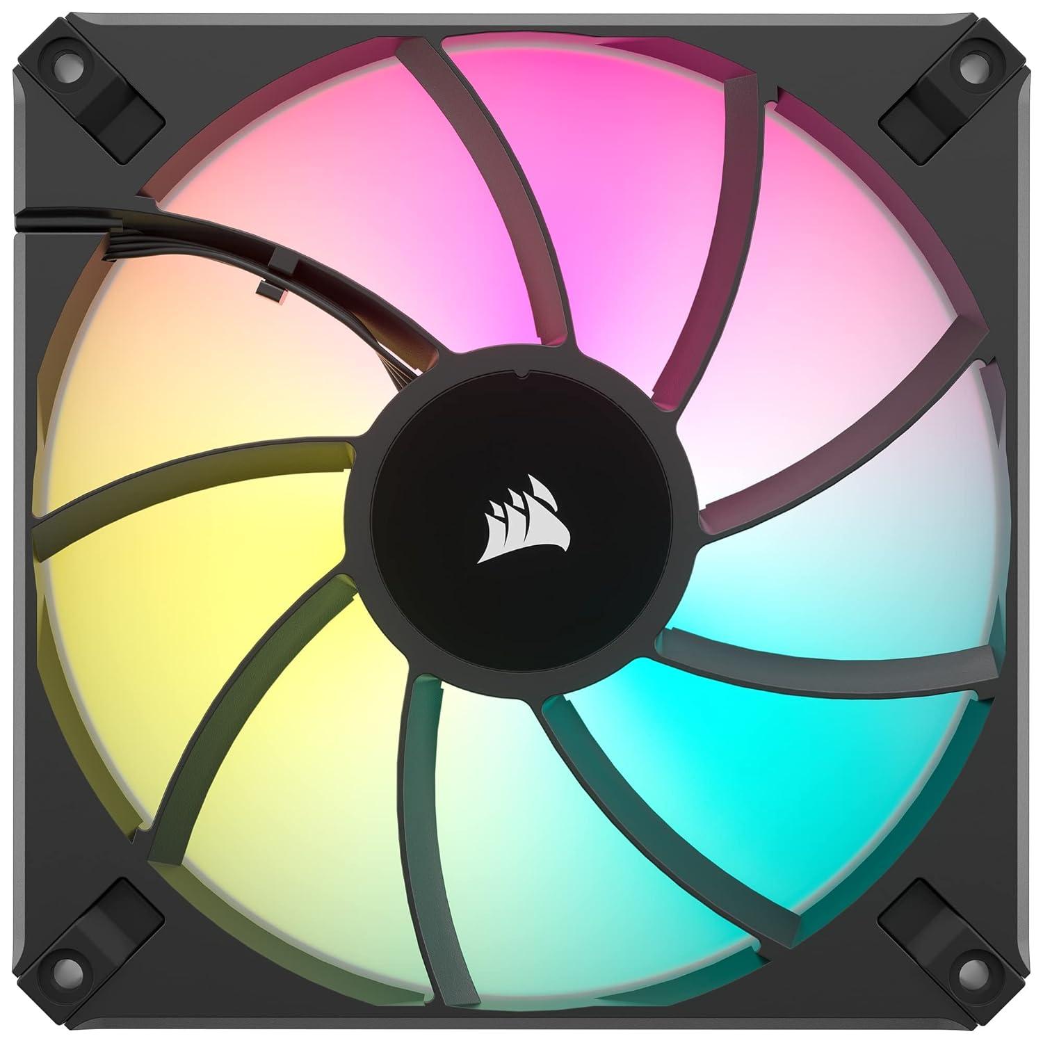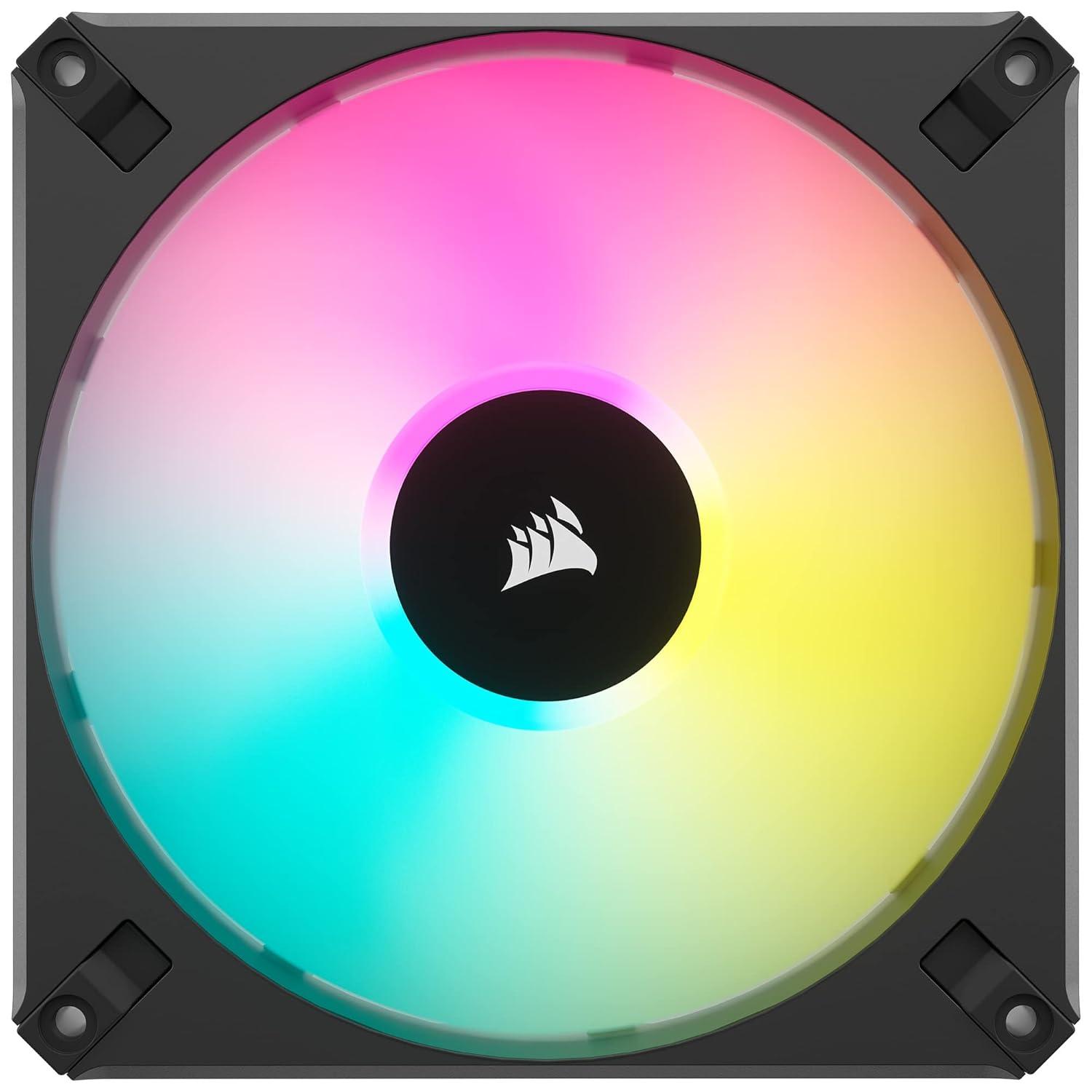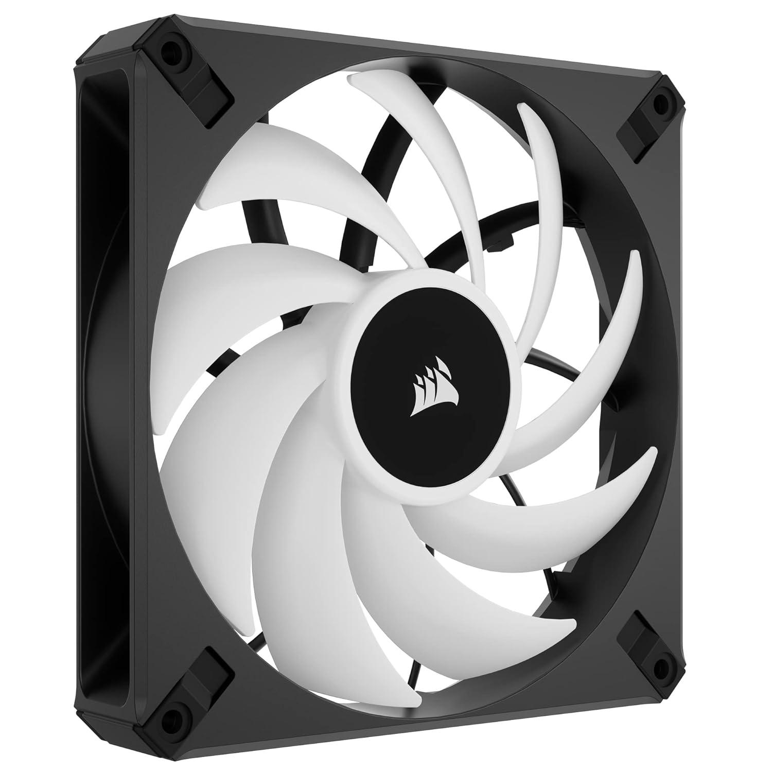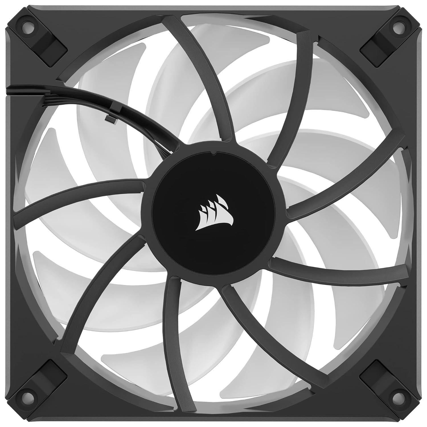 CORSAIR AF120 RGB ELITE High-Performance 120mm PWM fans deliver PWM-controlled fan speeds from 550 RPM up to 2,100 RPM for powerful cooling and quiet operation. A fluid dynamic bearing brings exceptional durability with minimal noise, while eight individually RGB LEDs illuminate your PC in brilliant RGB lighting. Control the light show with the included iCUE Lighting Node CORE controller, enabling you to plug up to six RGB fans for simplified, intuitive lighting. Each AF120 RGB ELITE fan pushes up to 65.57 CFM of air with 2.68mm-H2O of static pressure at full speed, for powerful airflow that perfectly suits use on heatsinks, radiators or as a case fan, with CORSAIR AirGuide technology anti-vortex vanes concentrating your cooling.