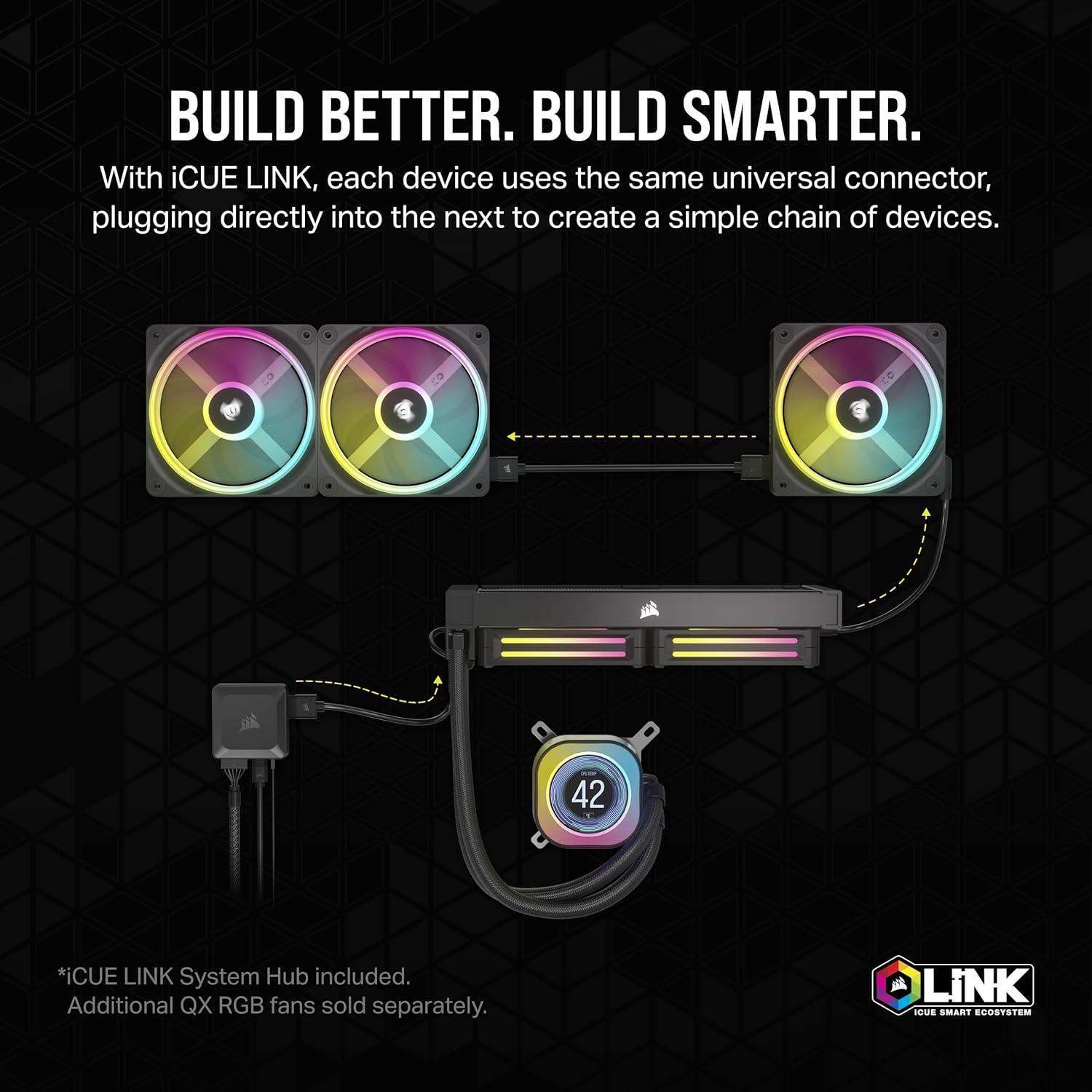 Effortless Connectivity & Intelligent Design: Take your build to the next level with the patent-pending iCUE LINK ecosystem, letting you chain all your components together using universal connectors, all plugged into a single port on the included iCUE LINK System Hub. Build faster, reduce cable clutter, and create a more intelligent, cohesive system setup