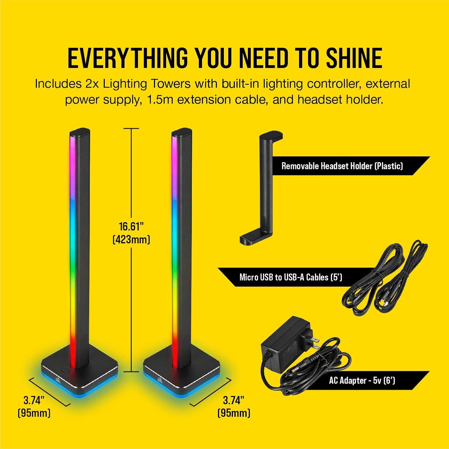 Extend your PC’s RGB lighting with the CORSAIR iCUE LT100 Smart Lighting Towers Starter Kit, part of the iCUE Smart Lighting Ecosystem. 92 RGB LEDs light up your room with ambient lighting that dynamically integrates with your games and media for a truly immersive experience. Cycle through 11 lighting profiles out of the box with push-button control or connect to CORSAIR iCUE software to synchronize your RGB lighting effects across all compatible CORSAIR devices in your system and all external iCUE Smart Lighting devices. The Starter Kit includes two lighting towers with 46 customizable LEDs each, housed in light-diffusing casing that softens and blends light. With an included removable headset holder, LT100 Smart Lighting Towers add convenient, versatile, and stunning RGB lighting to any setup.