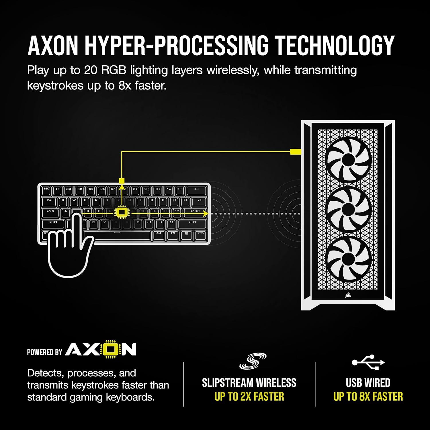 The CORSAIR K100 AIR Wireless Mechanical Gaming Keyboard delivers outstanding performance with an unbelievably thin brushed aluminum frame, connecting wirelessly with sub-1ms SLIPSTREAM WIRELESS and Bluetooth®, with secure AES 128-bit encryption. Tactile CHERRY MX Ultra Low Profile mechanical keyswitches are illuminated by brilliant per-key RGB, for the responsiveness and customizable lighting you demand of a premium gaming keyboard. Four dedicated, fully programmable macro keys boost your gameplay or productivity. Wired mode enables CORSAIR AXON Hyper-Processing Technology to transmit keystrokes up to 8x faster, while powerful CORSAIR iCUE software unlocks dynamic wireless RGB lighting control, key remaps, macro programming, and more. With up to 200 hours of wireless battery life, the K100 AIR enables you to play elevated.