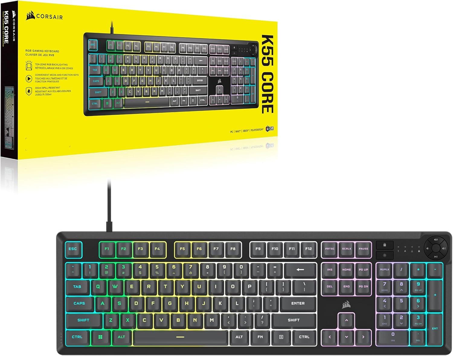 The CORSAIR K55 RGB PRO Gaming Keyboard lights up your desktop with vibrant five-zone dynamic RGB backlighting and powers up your gameplay with six easy to set up dedicated macro keys. The K55 RGB PRO is certified for IP42 dust and spill-resistance to stand up to wear, tear, and more, with a detachable palm rest to ensure all-day comfort. Quiet and responsive keys are comfortable for typing or gaming, and dedicated media keys put play, pause, and more within easy reach. CORSAIR iCUE software makes it easy to personalize your lighting and macros, while anti-ghosting and selective key rollover ensure your critical inputs are delivered when they matter most.