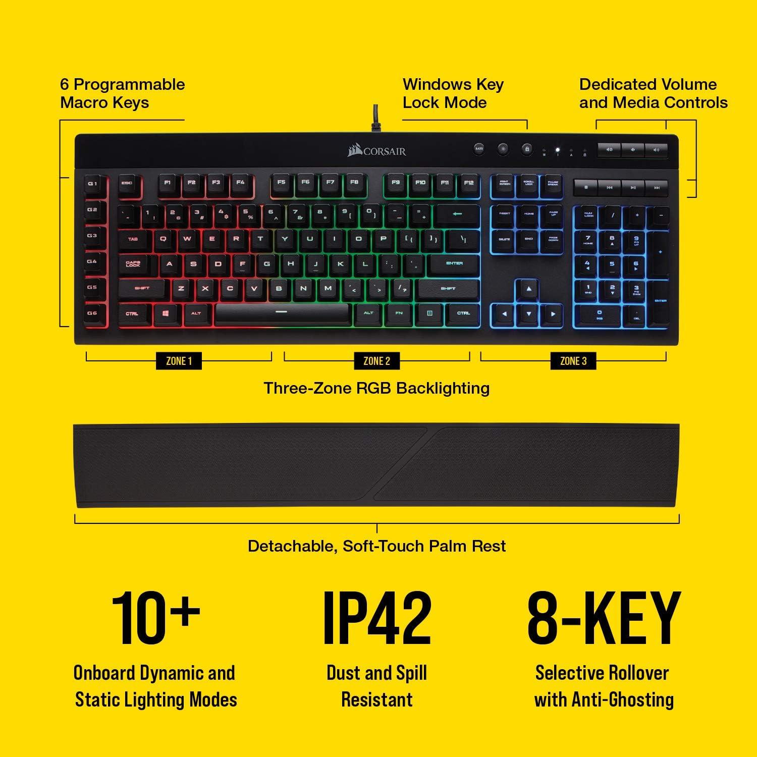The CORSAIR K55 RGB PRO Gaming Keyboard lights up your desktop with vibrant five-zone dynamic RGB backlighting and powers up your gameplay with six easy to set up dedicated macro keys. The K55 RGB PRO is certified for IP42 dust and spill-resistance to stand up to wear, tear, and more, with a detachable palm rest to ensure all-day comfort. Quiet and responsive keys are comfortable for typing or gaming, and dedicated media keys put play, pause, and more within easy reach. CORSAIR iCUE software makes it easy to personalize your lighting and macros, while anti-ghosting and selective key rollover ensure your critical inputs are delivered when they matter most.