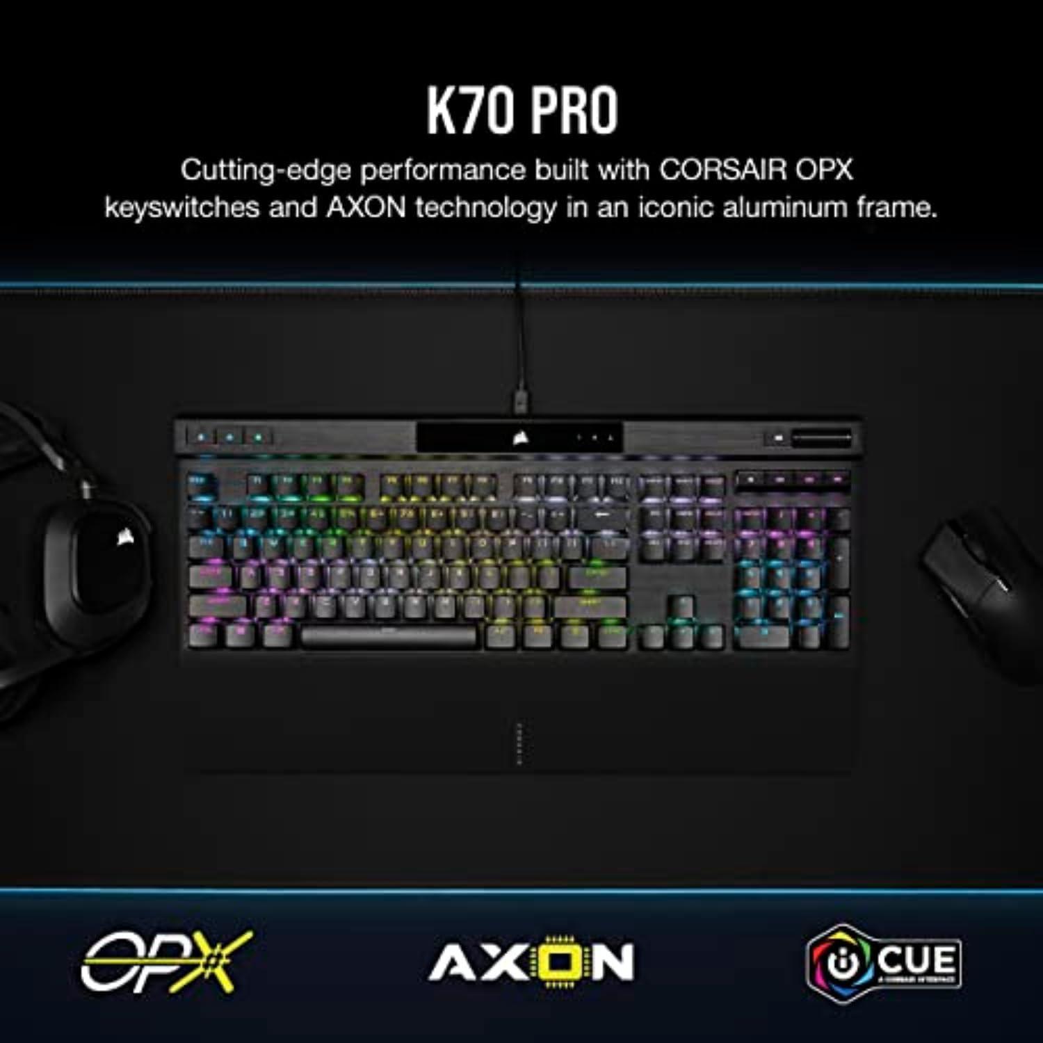 The CORSAIR K70 PRO RGB Optical-Mechanical Gaming Keyboard delivers cutting-edge performance, equipped with hyper-fast CORSAIR OPX optical-mechanical keyswitches and CORSAIR AXON Hyper-Processing Technology. Win in style with an iconic aluminum frame and dynamic per-key RGB backlighting topped by durable PBT double-shot keycaps, easy to take on the go with a detachable USB Type-C cable. Powerful iCUE software on both PC and macOS enables custom macro programming, key remaps, and more, while dedicated media keys and an aluminum multi-function volume roller offer convenient control over media. With a tournament switch for instant compliance with competition guidelines and onboard storage for up to 50 profiles, the K70 PRO is ready to take on any challenge.