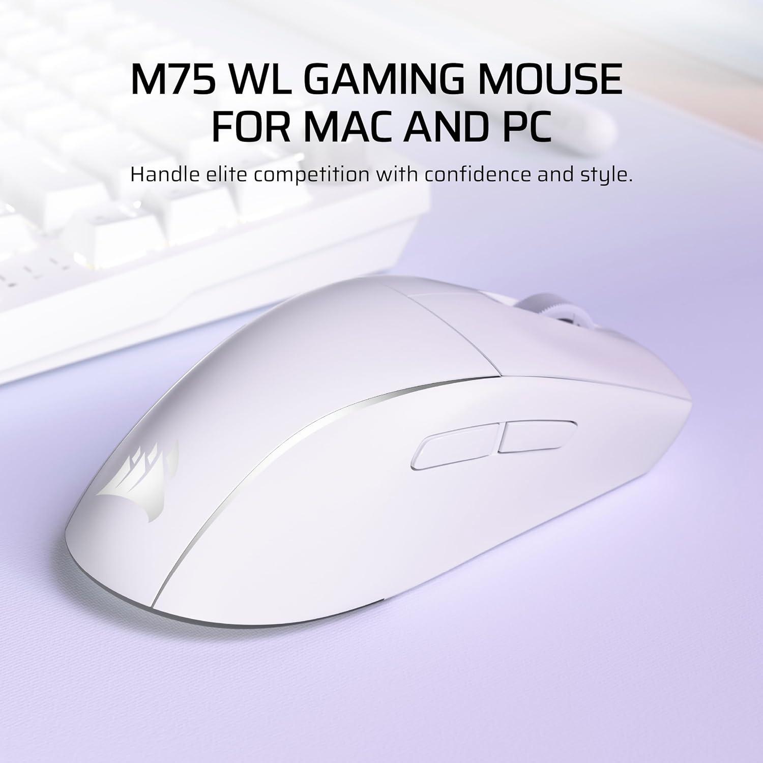 Sculpted by victory. Made for the spotlight. The M75 WIRELESS sports an expertly designed ambidextrous mouse shape, enabling right- and left-handed Apple gamers to handle elite competition with confidence and style. Weighing just 89g, the M75 WIRELESS allows for fast, fluid mouse movement, and can connect via near-zero lag SLIPSTREAM WIRELESS and Bluetooth®. Get pinpoint precision on tracking with the 26K DPI CORSAIR MARKSMAN sensor. Clicks also register quicker with optical switches guaranteed for 100 million clicks. The mouse features an understated default single-color lighting profile for Apple users, which can be customized in CORSAIR iCUE software.