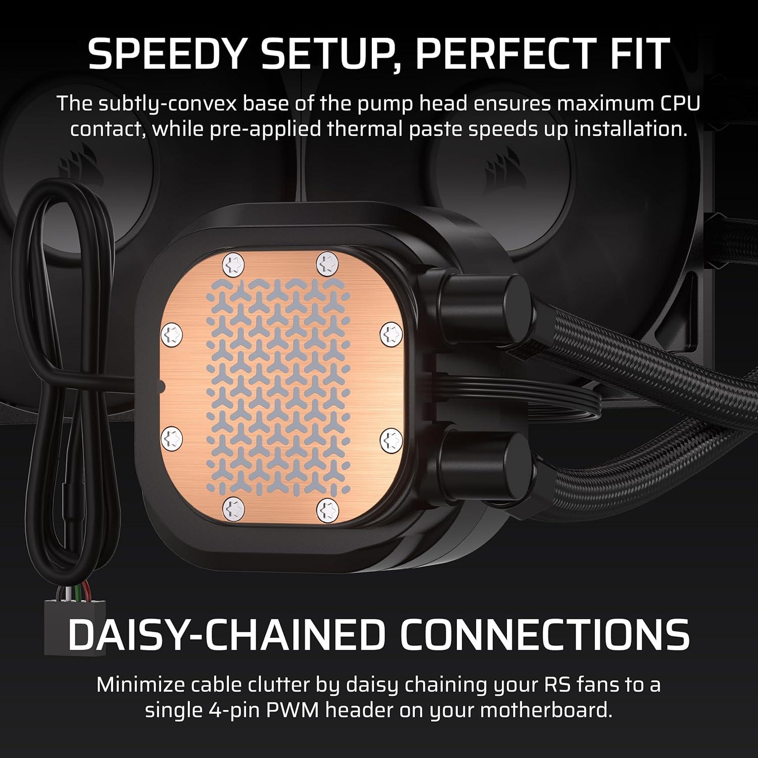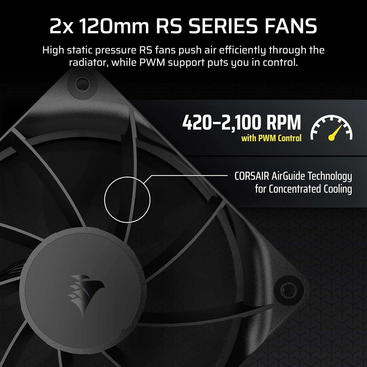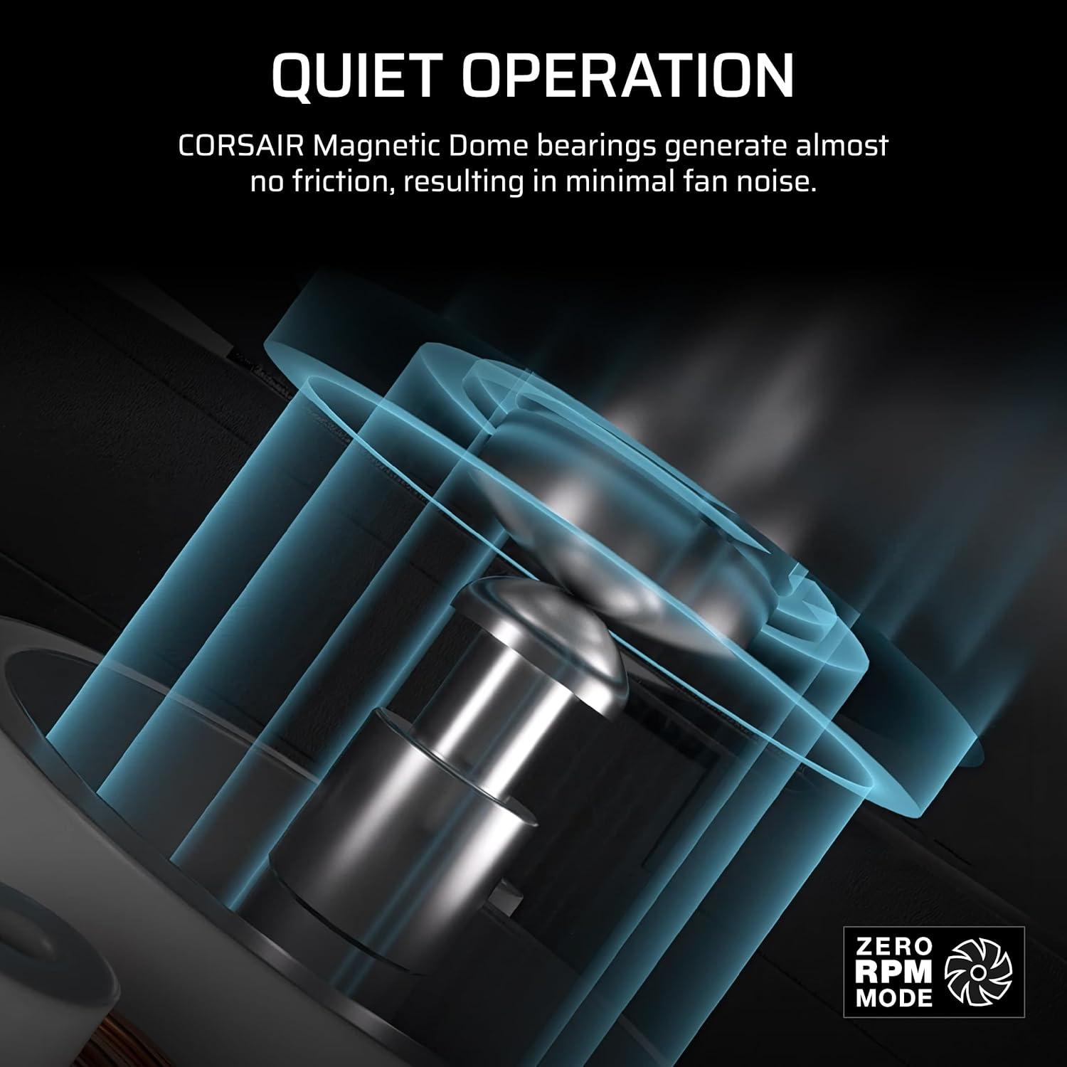 RS120 Fans – High static pressure RS fans push air efficiently through the radiator, while CORSAIR AirGuide technology and Magnetic Dome bearings deliver strong cooling with low noise