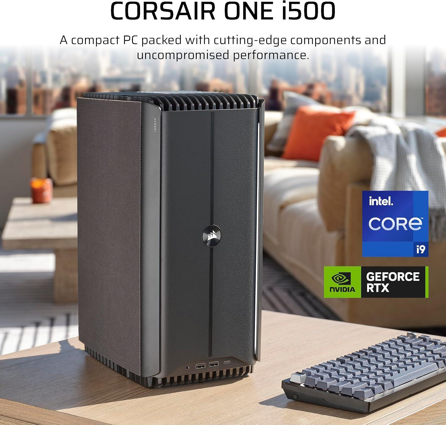 The CORSAIR ONE i500 redefines compact PC performance with a liquid-cooled 14th Gen Intel® Core™ processor and NVIDIA® GeForce RTX™ 40-series graphics card. Experience faster processing, ultra-quiet operation, and unrivaled graphics for seamless gaming and multitasking without compromise. Personalize the front panel and under glow lighting to suit your mood and elevate your setup with ease. Dive into a world of exceptional performance and immersive visuals, where every click and keystroke are met with unparalleled responsiveness. Elevate your computing experience with the CORSAIR ONE i500.