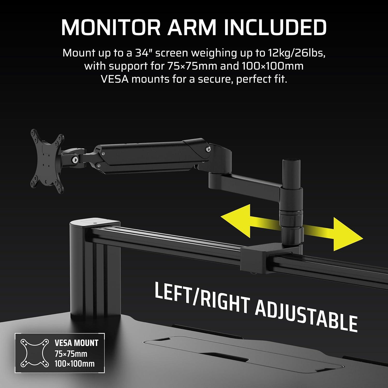 Monitor Arm Included: Compatible with 75x75mm or 100x100mm VESA mount monitors up to 27lbs / 12.5kg in weight.