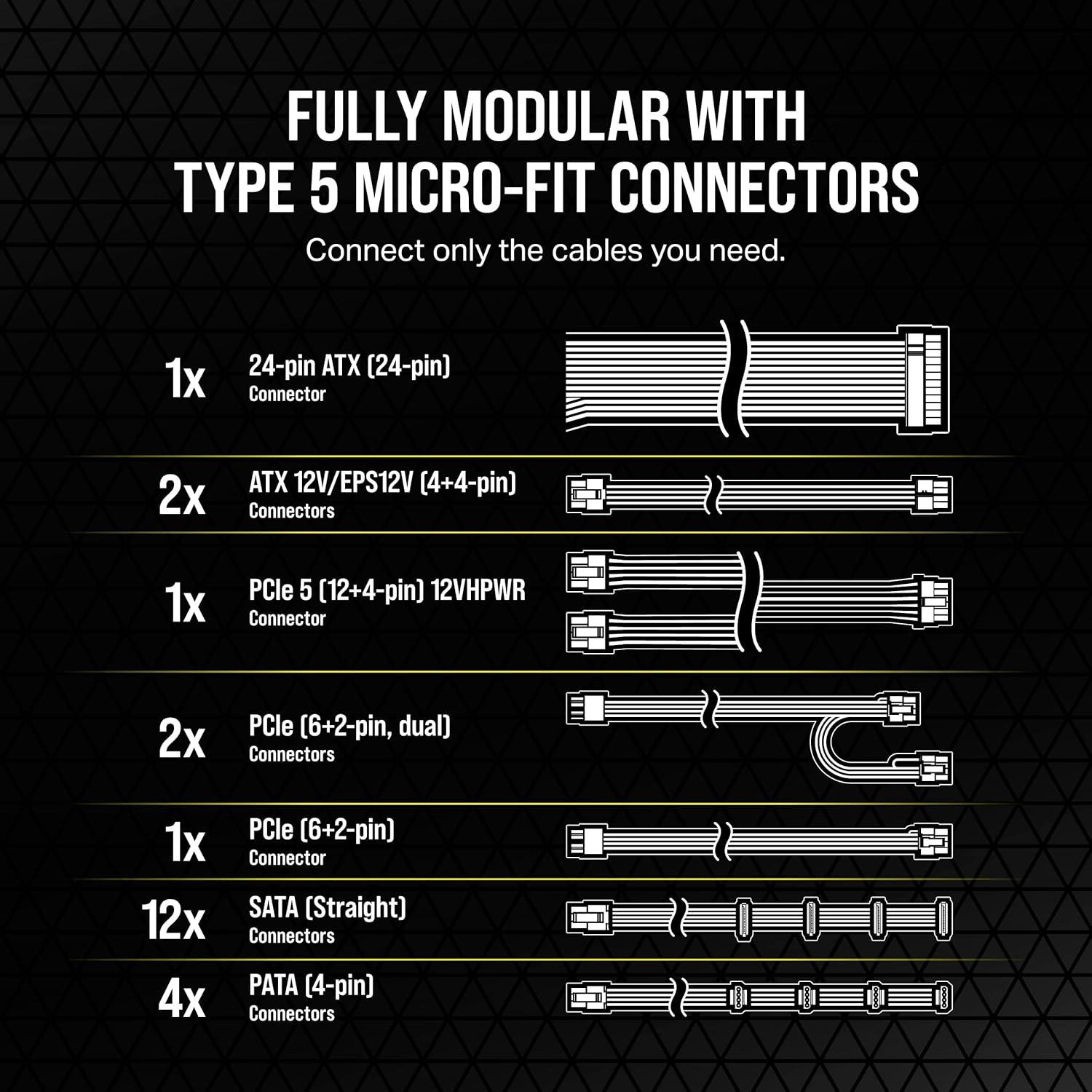 Fully Modular Micro-Fit PSU Connectors: CORSAIR Type 5 Gen 1 micro-fit PSU cables mean you only connect the cables your system needs while taking up less space.