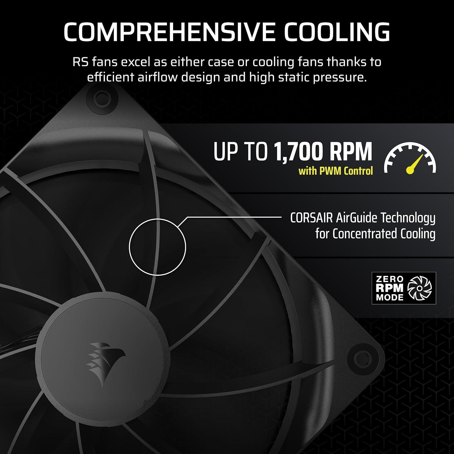 The CORSAIR RS120 ARGB 120mm PWM Fans Triple Pack gets your PC cooling setup off on the right foot with three efficient and reliable fans. Daisy-chained connectors let you link multiple fans together and control them all through just one 4-pin PWM and one +5V ARGB header on your motherboard. Enjoy fan speeds up to 2,100 RPM, with the static pressure to also serve as radiator fans. CORSAIR AirGuide technology with anti-vortex vanes directs airflow for concentrated, powerful cooling. Eight LEDs light up your build with simple +5V ARGB motherboard control. Magnetic Dome bearings ensure quieter operation and increased longevity, while Zero RPM mode offers silent operation at low loads.