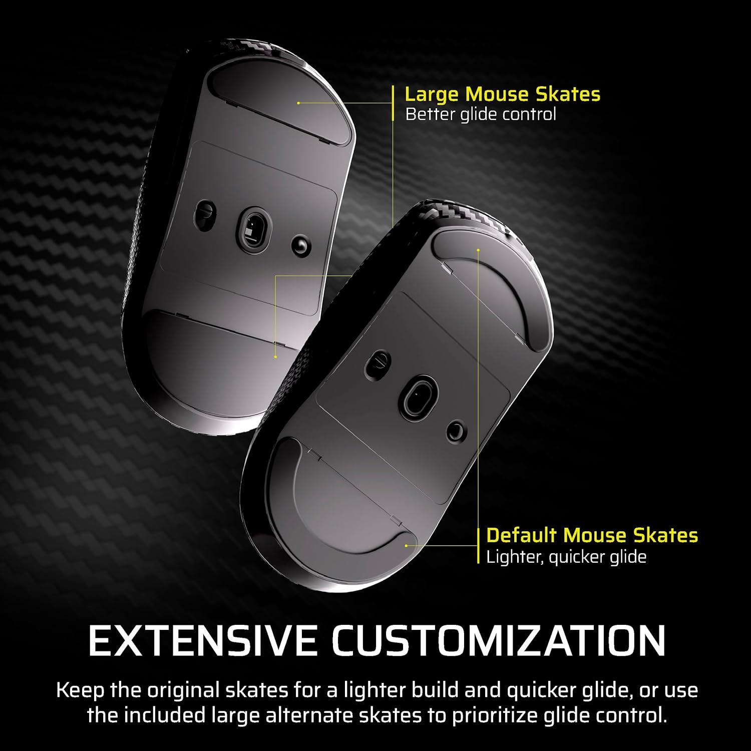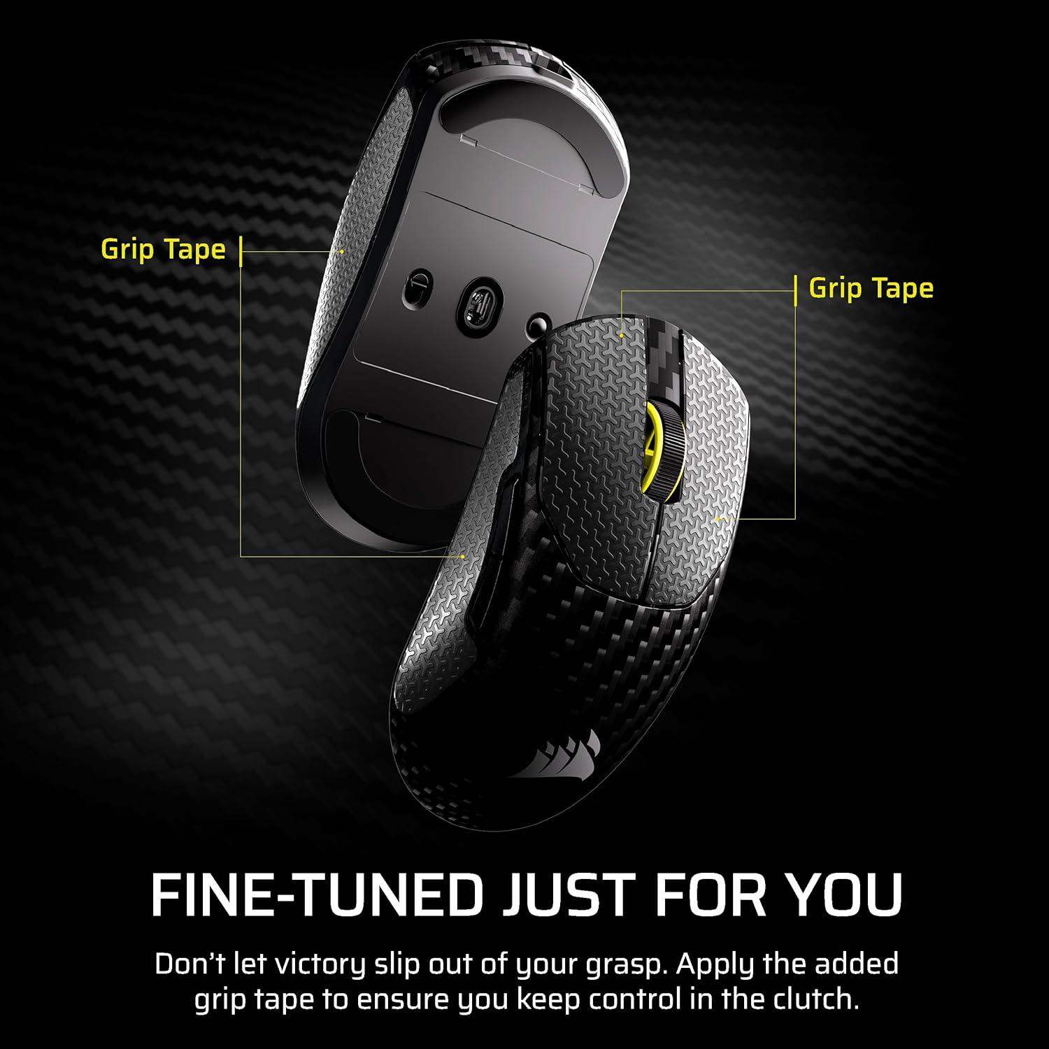 Get pro-level performance with the superlight 55g CORSAIR SABRE v2 PRO Wireless CF Gaming Mouse. Built beyond for elite FPS players who demand more. A symmetrical carbon fiber unibody delivers enhanced rigidity and strength on top of exceptional agility and precision. Its 8,000Hz hyper-polling and CORSAIR MARKSMAN S 33,000 DPI sensor deliver latency-defying responsiveness and pixel-perfect control. The light weight and up to 120 hours of 2.4GHz wireless freedom provide comfort and endurance to grind through competitive sessions. Customize it with the included additional grip tape, replacement skates, and lightweight, web-based CORSAIR Web Hub. Built Beyond.