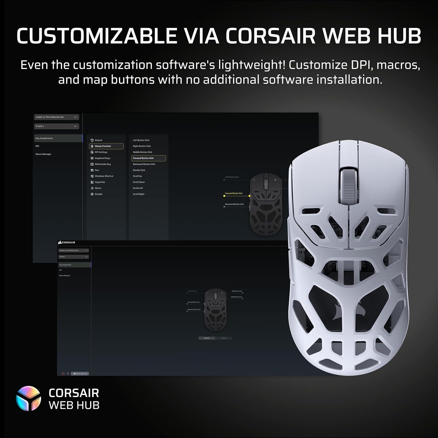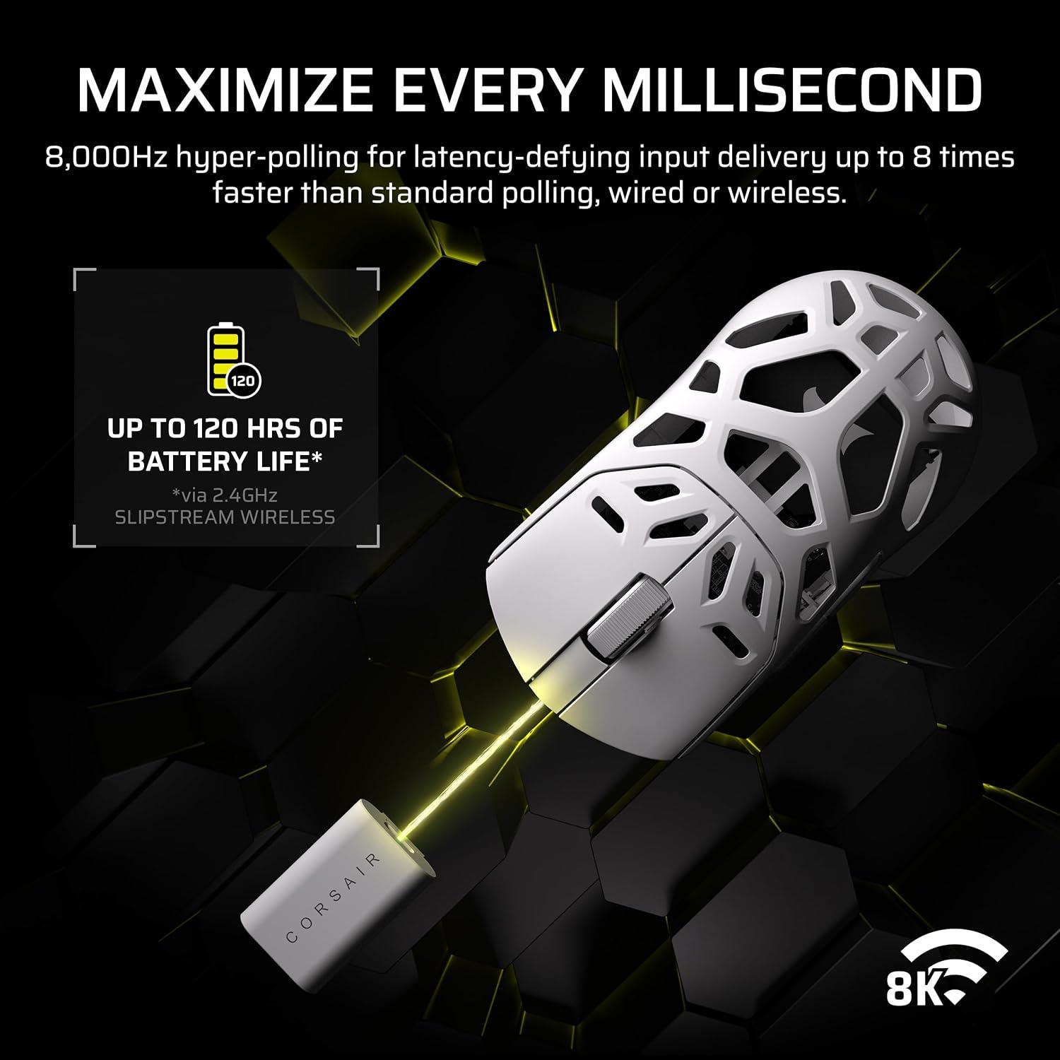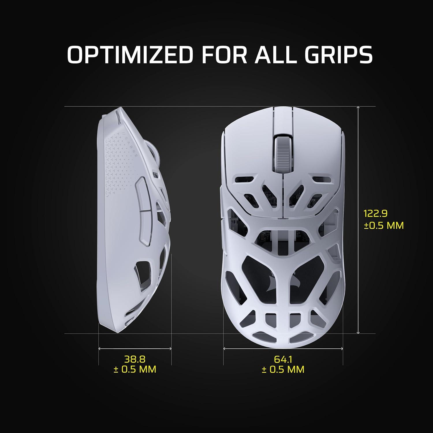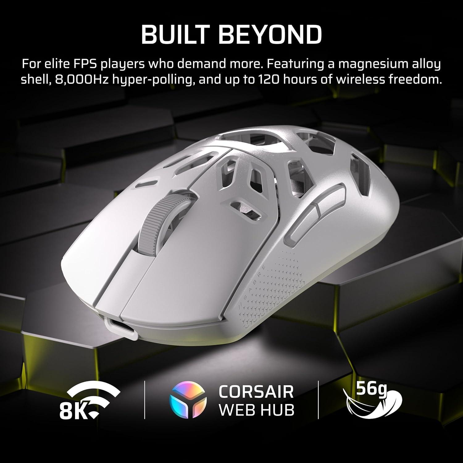 Get pro-level performance with the CORSAIR SABRE v2 PRO Wireless MG Gaming Mouse. Purpose-built for elite FPS players who expect exceptional precision but also want the cooling benefits and strength of a magnesium alloy shell. With its 8,000Hz hyper-polling and CORSAIR MARKSMAN S 33,000 DPI sensor, SABRE v2 PRO delivers latency-defying responsiveness and pixel-perfect control. The light weight, symmetrical shape, and up to 120 hours of 2.4GHz wireless freedom provide comfort and endurance to grind through competitive sessions. Customize it with the included additional grip tape, replacement skates, and lightweight, web-based CORSAIR Web Hub. Built Beyond.