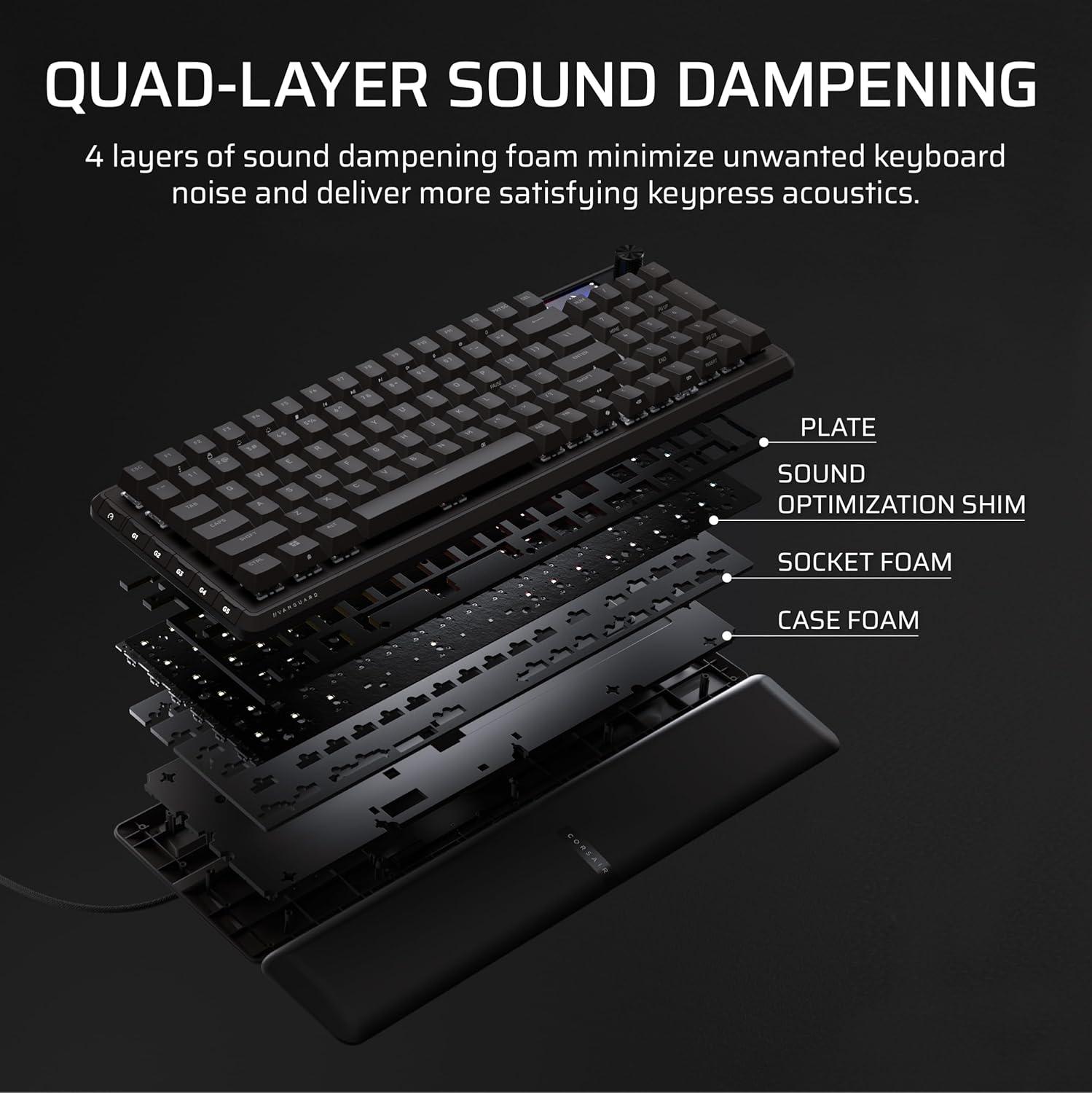 CORSAIR’s VANGUARD 96 pulls off the astonishing feat of shrinking a full keyboard with arrow keys, a tenkey pad, an LCD screen, rotary dial, and 6 programmable G-keys into a super-compact frame. Featuring wobble-free pre-lubricated CORSAIR MLX switches, it’s also hotswappable, supporting compatible 3-pin and 5-pin switches. The stunning LCD screen takes keyboard personalization to the next level with animations, stats, and game integration support. Quadlayer sound dampening provides satisfying keypress acoustics, and 8,000Hz hyper-polling delivers lightning-fast inputs. VANGUARD 96 also features Elgato Virtual Stream Deck integration, FlashTap SOCD handling, and easy customization via our web-based utility, CORSAIR Web Hub.