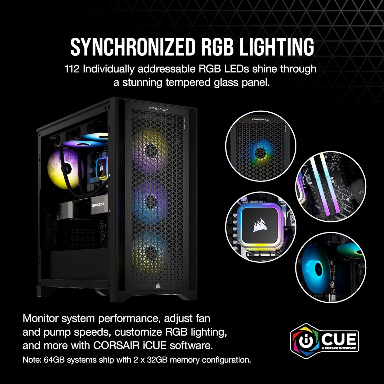 Step up your game with a CORSAIR VENGEANCE a7400 Series Gaming PC, powered by an AMD Ryzen 9000 Series CPU, NVIDIA GeForce RTX 40 Series graphics, and CORSAIR VENGEANCE RGB DDR5 Memory. Dynamic RGB lighting brilliantly illuminates the system, with powerful CORSAIR iCUE software to control lighting, fan and pump speeds, and more. The VENGEANCE a7400 Series is cooled by an H60x RGB ELITE liquid CPU cooler and six SP RGB ELITE fans with AirGuide technology for concentrated airflow. Equipped with a high-speed M.2 NVMe SSD, housed in a roomy CORSAIR 4000D AIRFLOW mid-tower case, and easily upgradeable thanks to a standard ATX form-factor, this is everything you need to game with a VENGEANCE.