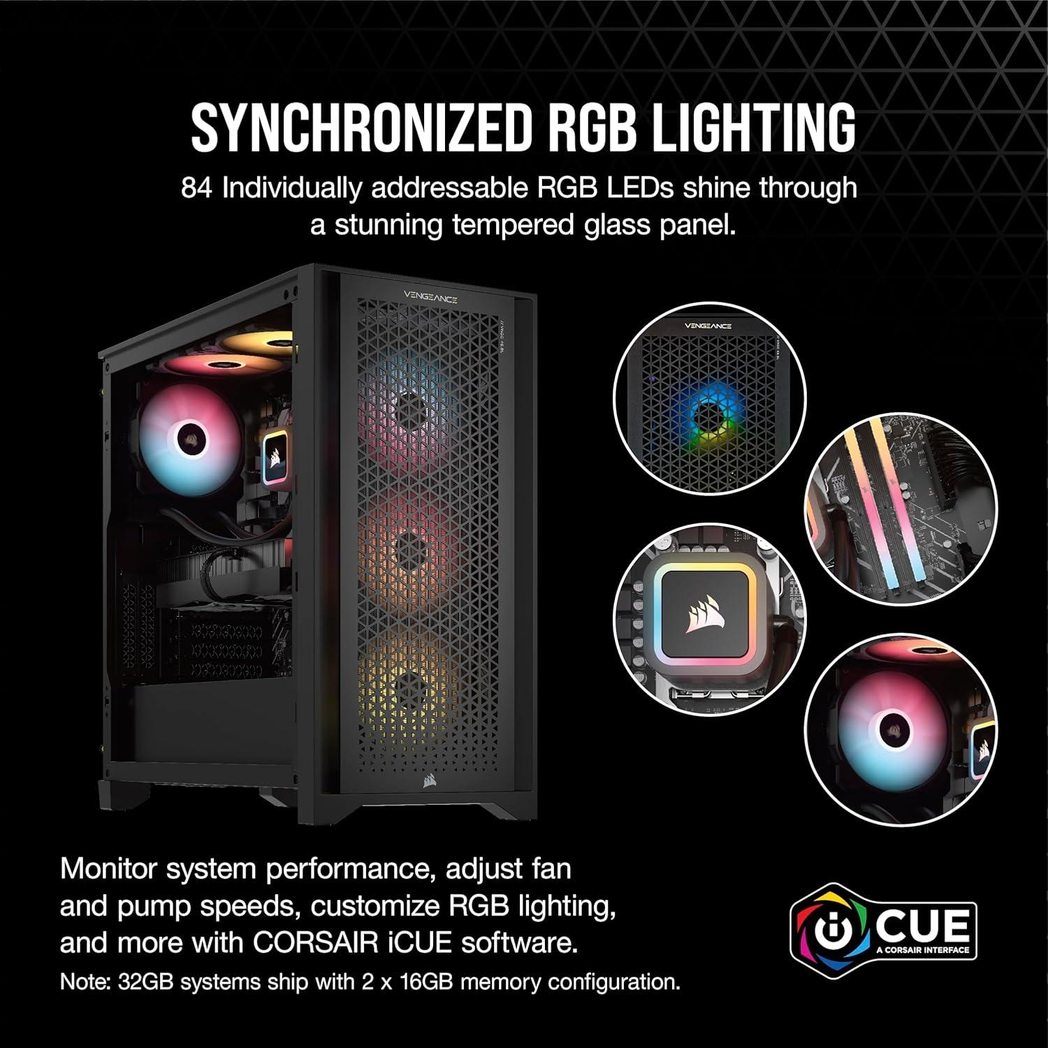 Step up your game with a CORSAIR VENGEANCE a7400 Series Gaming PC, powered by an AMD Ryzen 9000 Series CPU, NVIDIA GeForce RTX 40 Series graphics, and CORSAIR VENGEANCE RGB DDR5 Memory. Dynamic RGB lighting brilliantly illuminates the system, with powerful CORSAIR iCUE software to control lighting, fan and pump speeds, and more. The VENGEANCE a7400 Series is cooled by an H60x RGB ELITE liquid CPU cooler and six SP RGB ELITE fans with AirGuide technology for concentrated airflow. Equipped with a high-speed M.2 NVMe SSD, housed in a roomy CORSAIR 4000D AIRFLOW mid-tower case, and easily upgradeable thanks to a standard ATX form-factor, this is everything you need to game with a VENGEANCE.