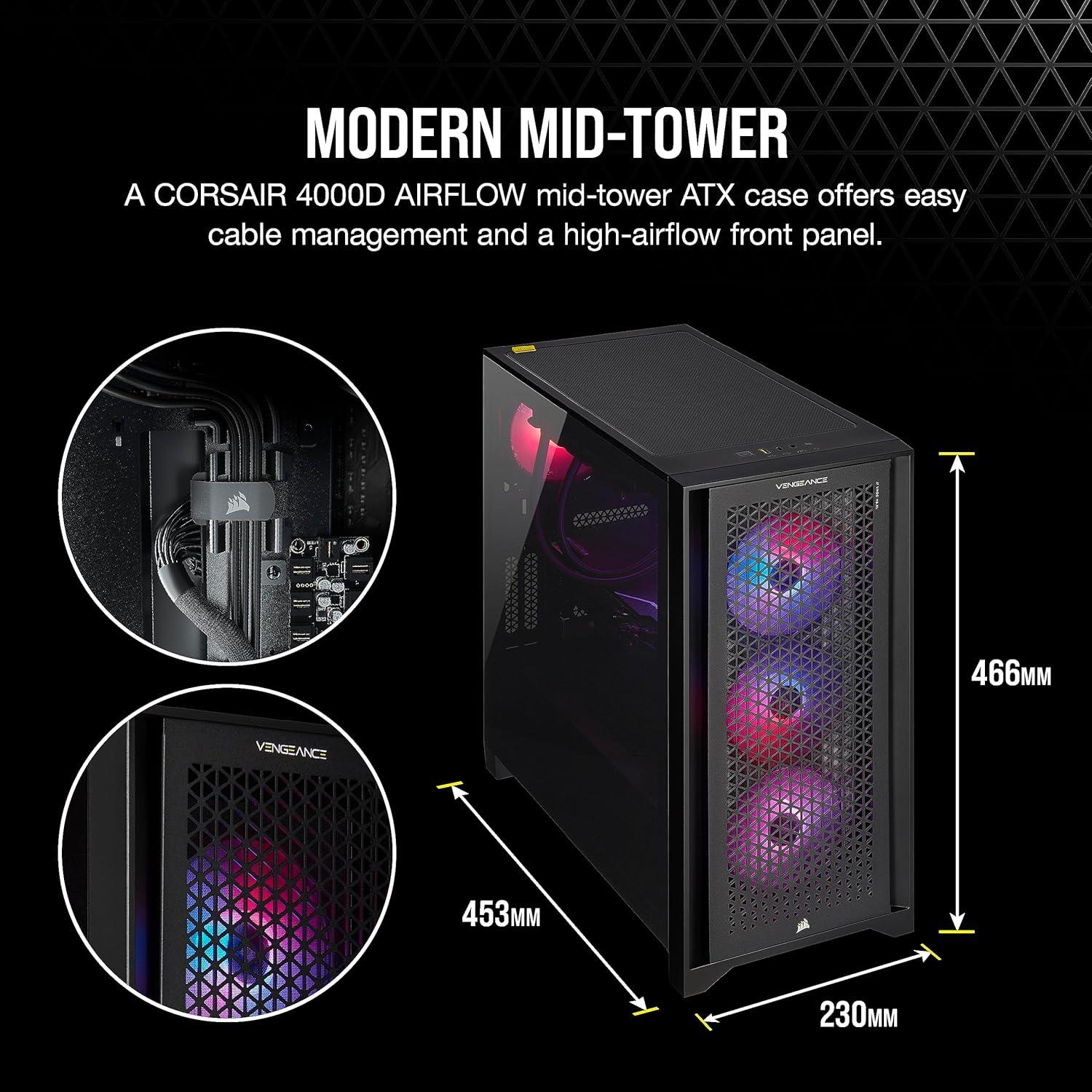 Step up your game with a CORSAIR VENGEANCE a7400 Series Gaming PC, powered by an AMD Ryzen 9000 Series CPU, NVIDIA GeForce RTX 40 Series graphics, and CORSAIR VENGEANCE RGB DDR5 Memory. Dynamic RGB lighting brilliantly illuminates the system, with powerful CORSAIR iCUE software to control lighting, fan and pump speeds, and more. The VENGEANCE a7400 Series is cooled by an H60x RGB ELITE liquid CPU cooler and six SP RGB ELITE fans with AirGuide technology for concentrated airflow. Equipped with a high-speed M.2 NVMe SSD, housed in a roomy CORSAIR 4000D AIRFLOW mid-tower case, and easily upgradeable thanks to a standard ATX form-factor, this is everything you need to game with a VENGEANCE.