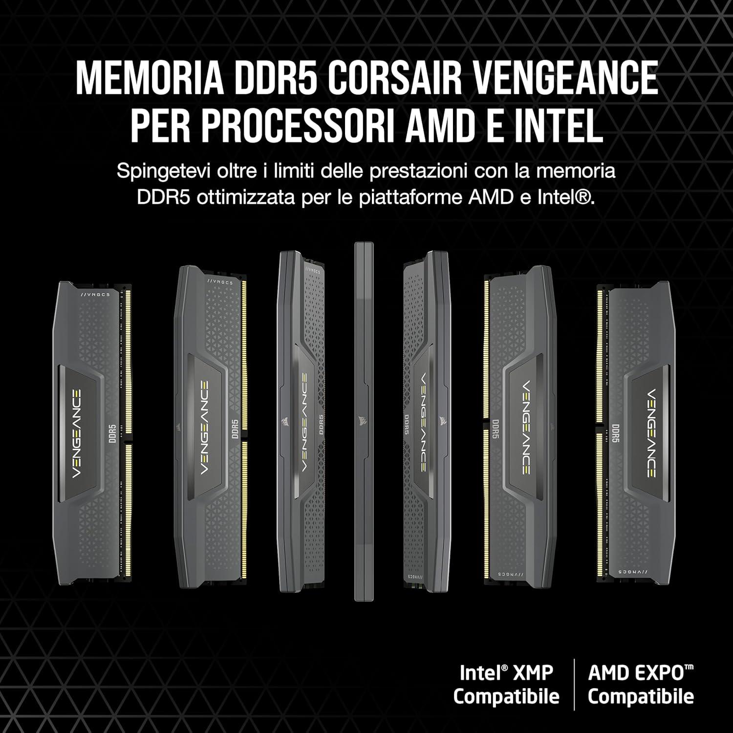 CORSAIR VENGEANCE DDR5 optimized for AMD motherboards delivers the higher frequencies and greater capacities of DDR5 technology in a high-quality, compact module that suits your system. Tightly-screened high-frequency memory chips power your PC through faster processing, rendering, and buffering than ever, with onboard voltage regulation providing reliable power for easy, finely controlled overclocking. CORSAIR iCUE software enables real-time frequency monitoring, and onboard voltage regulation. A distinctive solid aluminum heatspreader keeps your memory cool, while ensuring wide compatibility with a huge range of motherboards and CPU coolers. With a limited lifetime warranty as your guarantee of reliability for years to come, VENGEANCE DDR5 for AMD continues a long-standing legacy of memory performance. Density: 96GB (2 x 48GB) Speed: DDR5-6000MHz Tested Latency: 36-44-44-96 Voltage: 1.4V Format: DIMM LED: None PMIC: Overclock PMIC Software Control: CORSAIR iCUE Pin Out: 288 Technology: AMD EXPO & Intel XMP 3.0 Heatspreader: Aluminum Compatibility: AMD 600 Series, Intel 700 Series