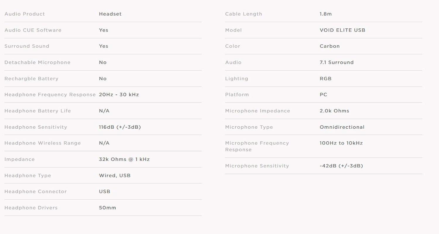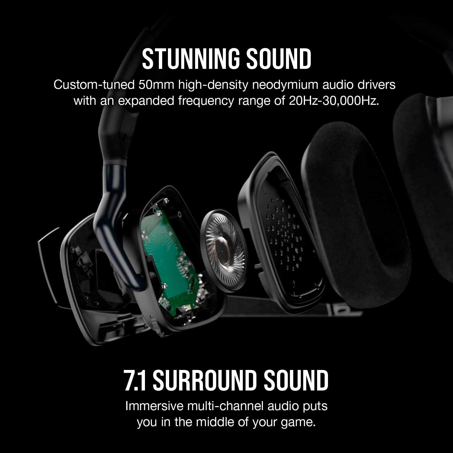 Immerse yourself in the action with the Corsair void RGB Elite wireless with custom-tuned 50mm neodymium audio drivers delivering 7.1 surround sound on PC Microfiber mesh fabric and memory foam ear pads provide lasting comfort Connect to your PC or PS4 with a low-latency 2.4GHz wireless connection with a range of up to 40ft and all-day battery life up to 16 hours An omnidirectional microphone with LED mute indicator ensures that you're heard with exceptional vocal clarity The void RGB Elite's distinctive design and durable construction are complemented by fully customizable RGB lighting on each ear cup Powerful Corsair iCUE software ties everything together enabling full control over equalizer settings 7.1 surround sound RGB lighting.